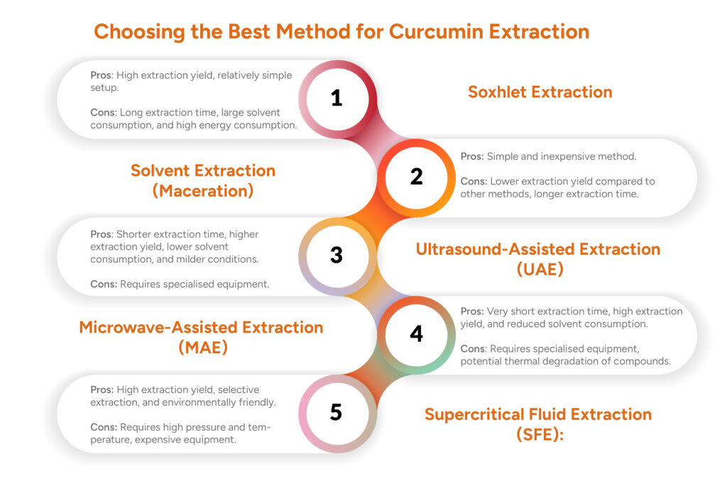 Curcumin can be extracted in different ways, each with its own advantages and disadvantages. The way to extract curcumin depends on the requirement and need. Solvent extraction is among the more basic techniques and requires a simple setup—this could benefit those without access to advanced technology and expertise. If it’s essential oils you’re after, steam distillation and supercritical CO2 extraction could be your answer. Newer approaches are being tested continually. These could pave the way for more need-specific and efficient ways of curcumin extraction.
