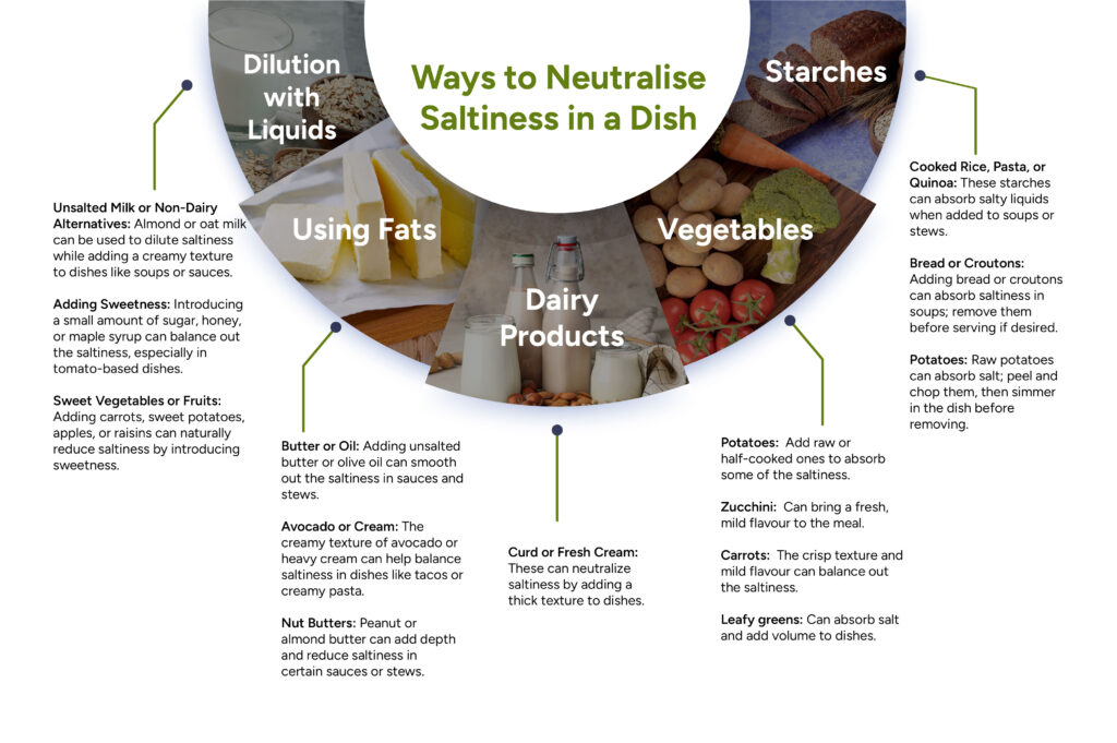 A drizzle of lime or lemon juice when it comes to meats and fish, a dash of vinegar, or some tomatoes can easily recover oversalted dishes and let the flavours shine. Depending on the flavour profiles, different acidic components can neutralise saltiness in a dish and naturally blend with the dish. For example, distilled white vinegar and rice vinegar are versatile options that go with multiple dishes. In specific instances, apple cider vinegar can be used where sharp, fruity flavours are at play—in marinades and salads.