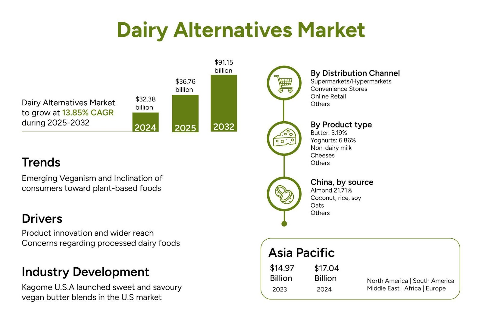 According to one industry report, the global dairy alternatives market was worth just over USD 30 bn in 2024 and is projected to go above USD 90 bn by 2032. Asia Pacific—spurred by urbanisation, higher incomes, and foreign investments—presently leads the world dairy alternatives market. Also propelling the region’s growth is increased consumer awareness around health and fitness and the shift to products that offer an added nutritional or health benefit—something shared with most of the rest of the planet. Escalating raw material costs and scarcity of resources in places like Africa and Northern Asia are turning manufacturers towards the region, which essentially has the advantage of cost-effective production and processing to go alongside high demand.